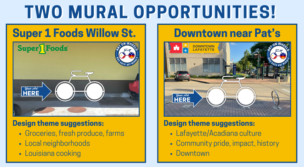 If you are an artist, we invite you to submit a design with the Call for Artists Form. Artists of any age and skill level are encouraged to apply. If you’re interested in a Bike Rack Art Mural for your business, we invite you to fill out the Interest Form. Stay tuned to our social media pages on Facebook and Instagram for more project updates as we try to create a more colorful, bike-friendly community here in Lafayette!